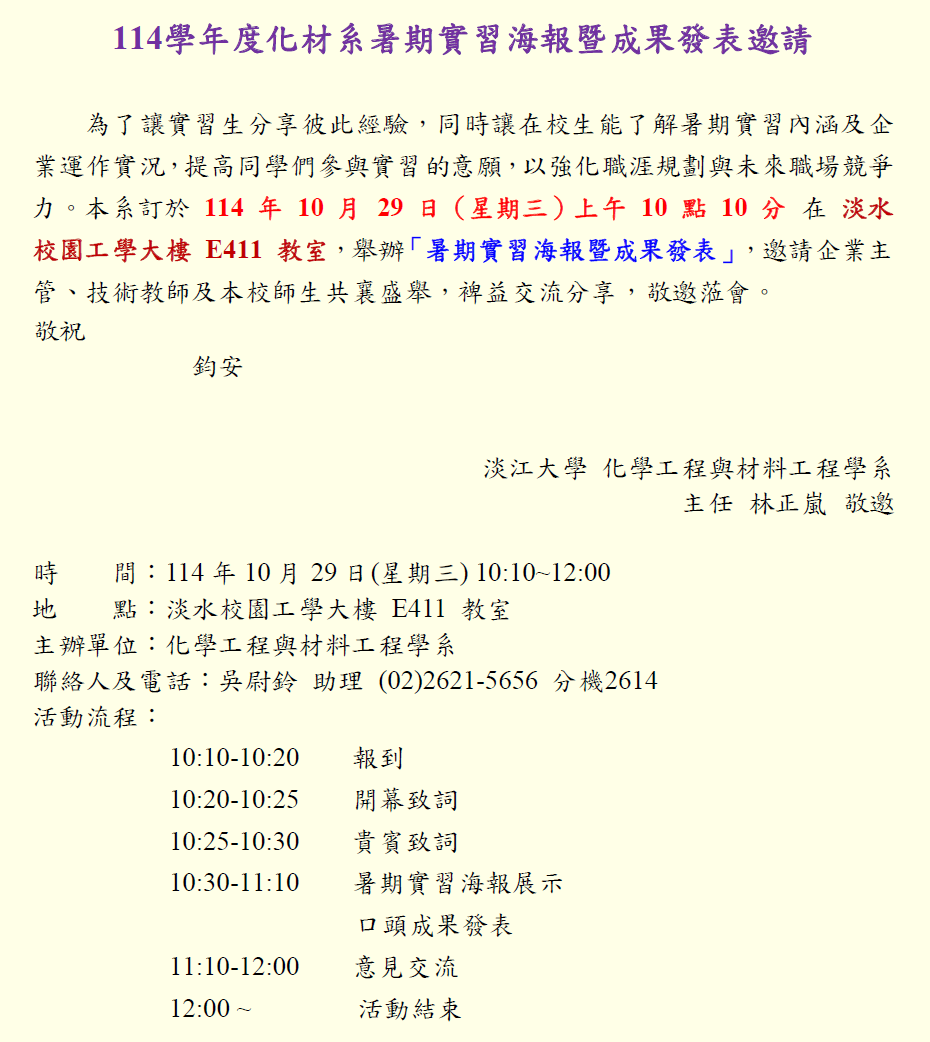 114學年度化材系暑期實習海報暨成果發表10/29(三)10:10在E411