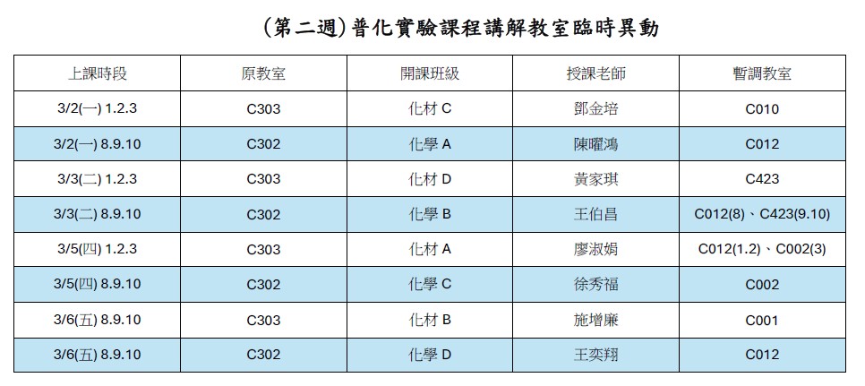 114(2) 大一-普化實驗 講解教室異動(第2週) 公告