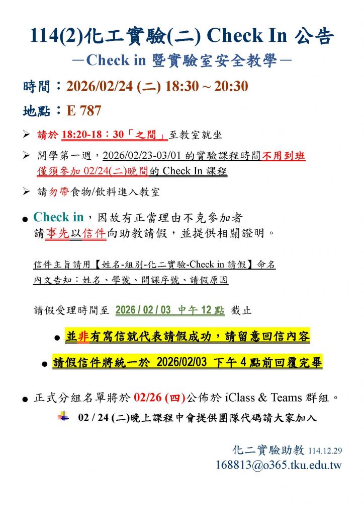 114(2) 大三-化工實驗(二) Check In 公告