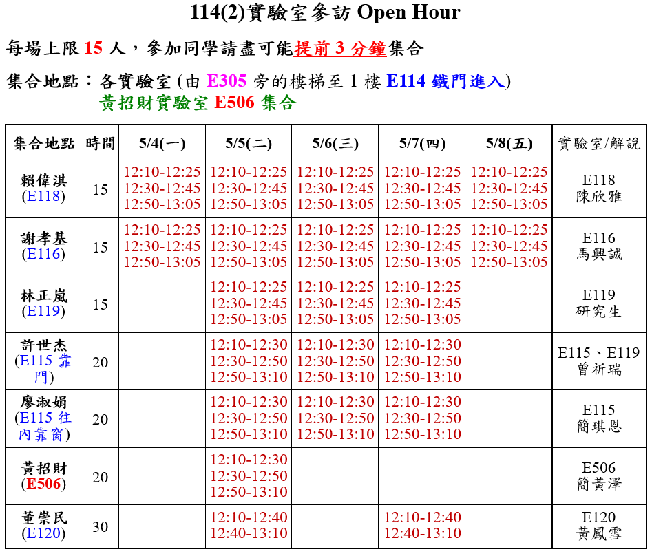 集合地點:各實驗室 (由E305旁的樓梯至1樓E114鐵門進入),黃招財實驗室E506集合